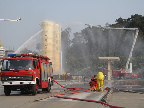 15:30分,随着生产部报警声响起,LNG灌区爆发泄漏,现场指挥接警后立即按响报警器,指挥相关小组启动消防水泵,对灌区进行紧急喷淋,隔离相邻储罐,并组织员工按预定区域抵达避难位置。市消防派出2辆高喷消防车、6辆水罐消防车抵达起火现场,火情侦检组随即展开侦检,先用泄露仪对现场进行浓度检测,并用隔离带划出相应的警戒线,保安配合警戒组疏散区域内无关人员及在场使用中的车辆熄火,同时关闭大门,禁止除消防车、抢险车外的一切车辆收支。在得知了着火位置和泄漏水平后,中队指挥员立即下令,展开灭火行动。消防队员穿上消防战斗服、佩戴防毒面具和呼吸器、携带铜质工具和灭火器材迅速赶往事故储罐,关闭储罐根部所有阀门。而其余消防车凭据预期指定位置,全方位对LNG灌体进行火灾扑救。