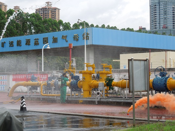 当天上午9时许,由演练总指挥副总裁黄剑锋正式下达演练指令,演习的内容为荔园站遭到恐怖袭击,调压站设备压力表遭到破坏,泛起泄漏,被荔园站保安和员工发明并实时控制,封闭现场启动应急机制。随后,场站人员及消防部分通过向泄漏处喷洒消防水降低现场天然气浓度,抢险组加入后对受损管线进行切换,包管天然气正常供应,并更换受损仪表,上午10时顺利抢修完毕并恢复使用。